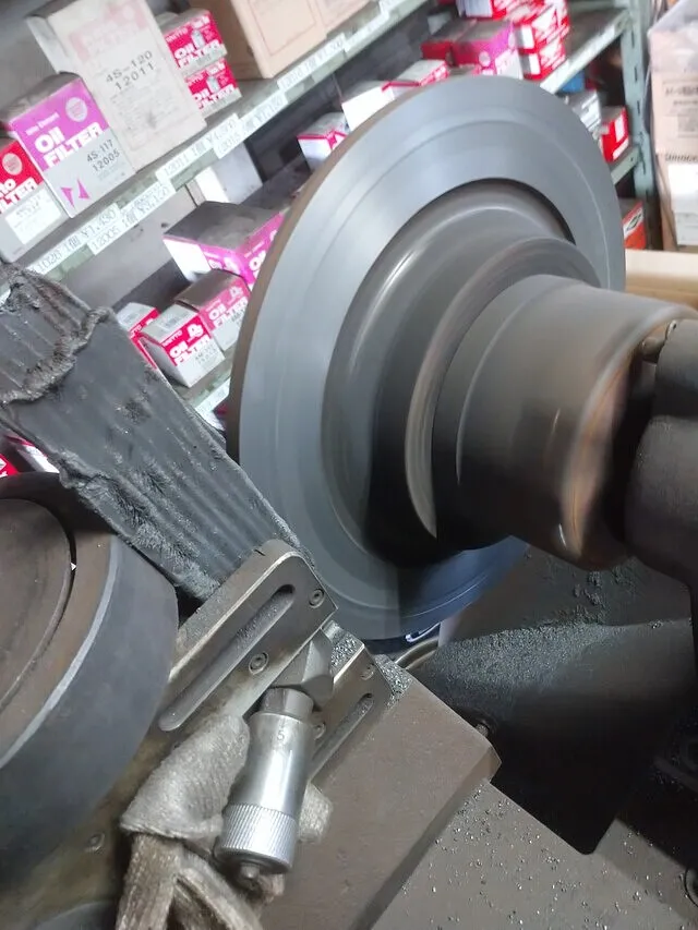 現場ではまず原因をしっかり見極め、今回はディスクローター表面の鏡面化が原因で、専用機械を使用して表面をなめらかに整えていきます。
