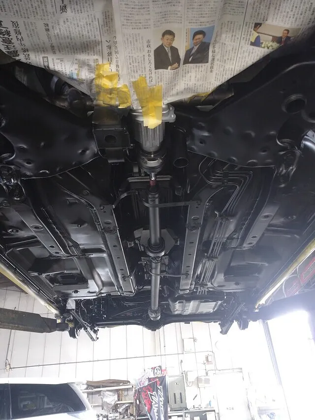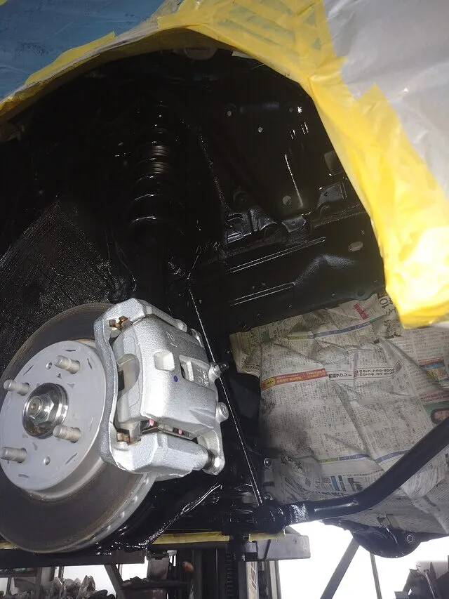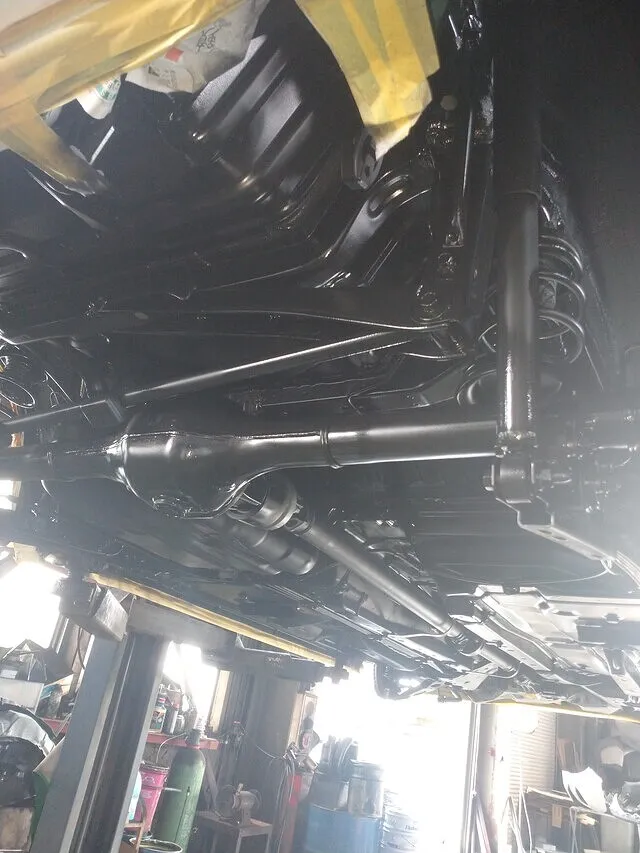 ジェットヒーターで強制乾燥したあとマスキングを剥がし、アンダーカバーやマフラーをもとに戻して作業完了です。