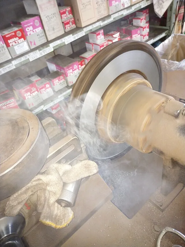 今回は特に、ブレーキ性能を左右するディスクローター研磨にも力を入れて作業しています。