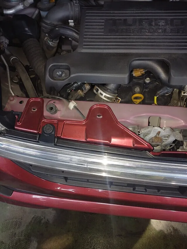 まずボンネットを開けて驚いたのは、フロントバンパー取付のクリップが上面一か所、バンパーサイド左右各一ヵ所しか固定されていませんでした。固定されていない上部三ヵ所、下部二か所をきちんとクリップで固定します。