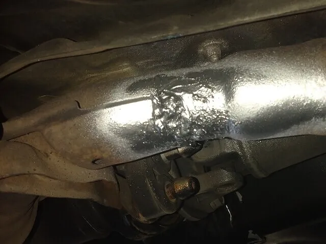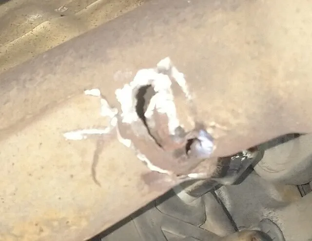 遮熱板(保護カバー)の隠れた溶接部分から錆びて穴が開いていました。周りのパイプ部分も