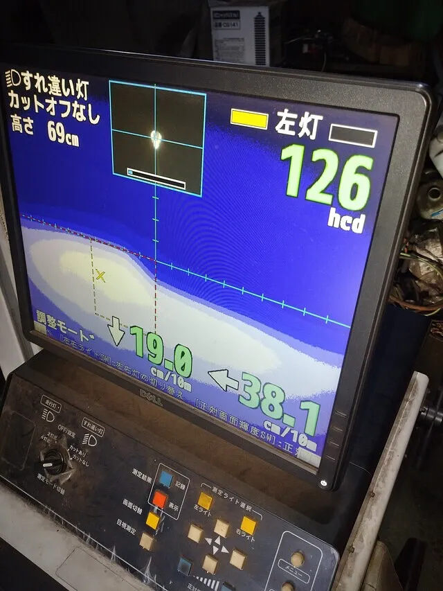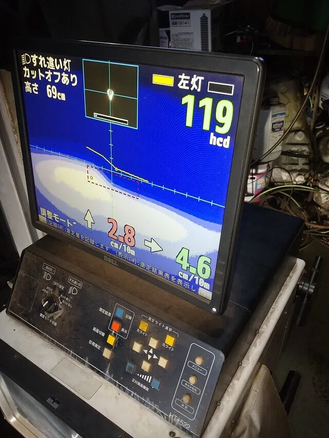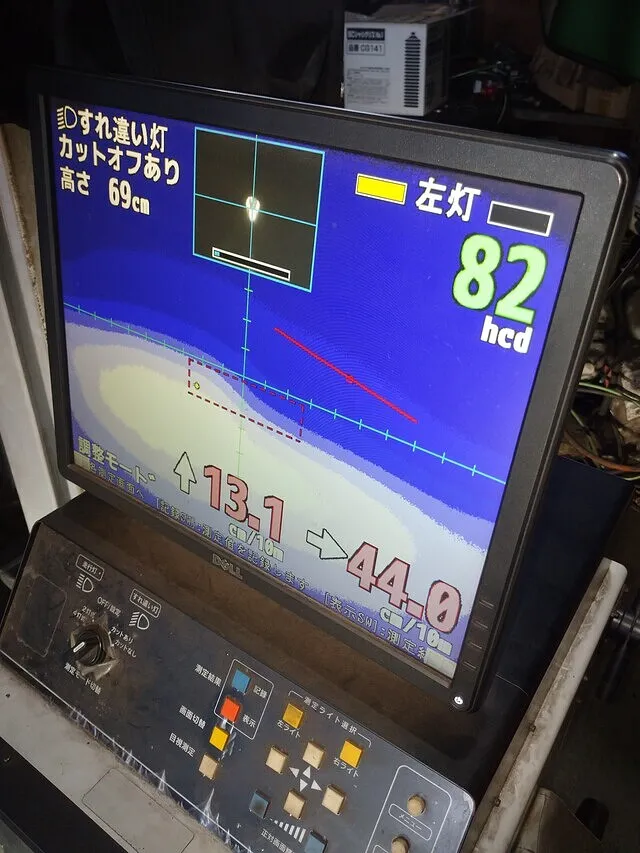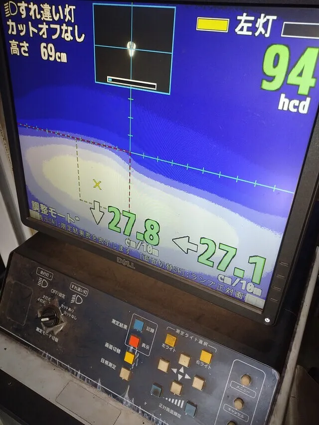 今回はヘッドレンズ自体の劣化(気泡が入ったような状態)でカットオフラインがうまく検査機械が読み込みしていないので、合格範囲内に調整して検査完了です。