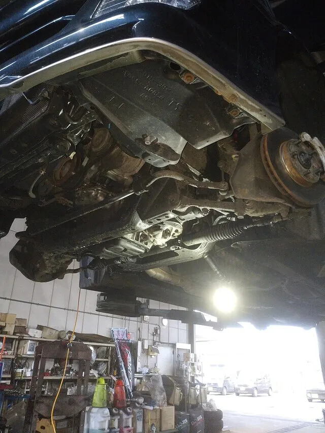 リフトで持ち上げられた車両の下に立つと、普段は見えない部分がしっかりと目に入ります。